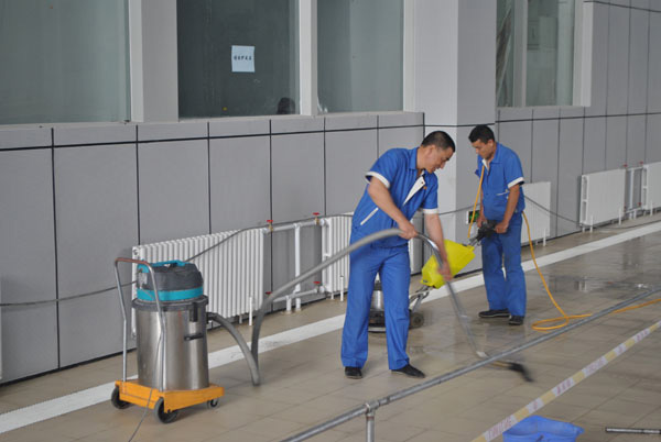 圖為公司員工使用洗地機(jī)和吸塵吸水機(jī)清洗地面的場(chǎng)景